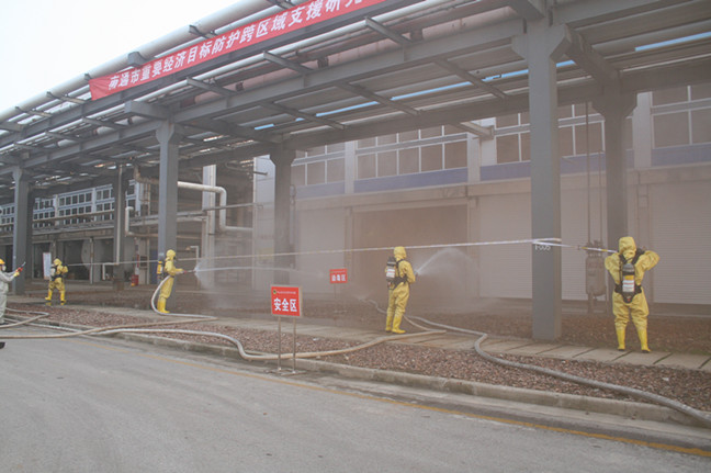 只見噴淋洗消裝置在值長的指示下及時開啟??傊笓]接到報告后立即指示啟動氯氣泄漏應(yīng)急預(yù)案,并通知公司防護(hù)專業(yè)分隊至泄漏區(qū)進(jìn)行搶險救援。隨著現(xiàn)場氯氣的擴(kuò)散,氯堿事業(yè)部的SIS系統(tǒng)自動啟動,液氯泄漏區(qū)的廠房全部自動關(guān)閉,氯氣吸收系統(tǒng)自動啟動,將泄漏的氯氣封閉在廠房內(nèi),防止氯氣向外擴(kuò)散。公司對重大危險源管控的工程措施在此刻發(fā)揮了重要作用,為應(yīng)急堵漏贏得了時間。演練中,參演人員各司其職,現(xiàn)場加強警戒進(jìn)行標(biāo)示,及時疏散人員,快速處置氯氣泄漏,緊急搶救中毒人員,時刻監(jiān)測周邊環(huán)境……