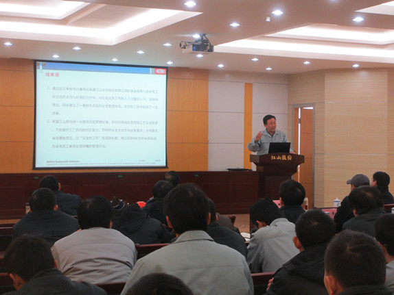 12月12日下午,杜邦安全改善項目年度審核末次會議在江山股份西區(qū)6號會議室召開。該公司總經(jīng)理薛健發(fā)表重要講話。 12月8日至11日,杜邦審核老師對我公司杜邦安全改善項目進行階段性審核。本次審核依據(jù)的是杜邦安全管理系統(tǒng)的行為安全(安全文化機制)和工藝安全(風險管理機制)22要素審核清單。審核老師主要通過訪談、查閱、觀察三種方法了解公司當前的HSE管理現(xiàn)狀,并進行審核評分。