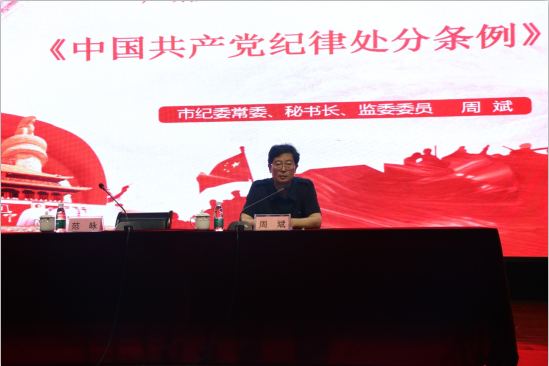 為全面貫徹習(xí)近平新時(shí)代中國特色社會(huì)主義思想和黨的十九大精神,對(duì)全面從嚴(yán)治黨、加強(qiáng)紀(jì)律建設(shè)作出再部署,充分發(fā)揮黨紀(jì)法規(guī)標(biāo)本兼治利器作用,切實(shí)加強(qiáng)以黨員干部為重點(diǎn)的全社會(huì)廉潔教育,5月27日下午,市紀(jì)委常委、秘書長、監(jiān)委委員周斌以“守紀(jì)律 講規(guī)矩”為主題,深入解讀《中國共產(chǎn)黨紀(jì)律處分條例》,上了一堂生動(dòng)的專題講座。南通產(chǎn)業(yè)技術(shù)研究院及下屬公司全體人員、陸洪社區(qū)黨員代表、園區(qū)入駐企業(yè)黨員干部等參加了活動(dòng)。