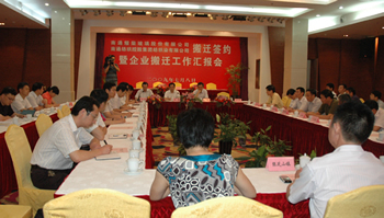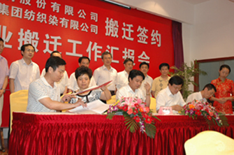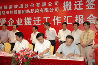 7月8日,在市經(jīng)貿(mào)委主持下,我公司與耀榮玻璃、紡織染簽訂《企業(yè)搬遷合同》。市政府徐輝副市長(zhǎng)、宗劍峰及崇川區(qū)、通州區(qū)、政府相關(guān)部門(mén)及我公司有關(guān)領(lǐng)導(dǎo)出席簽約儀式。